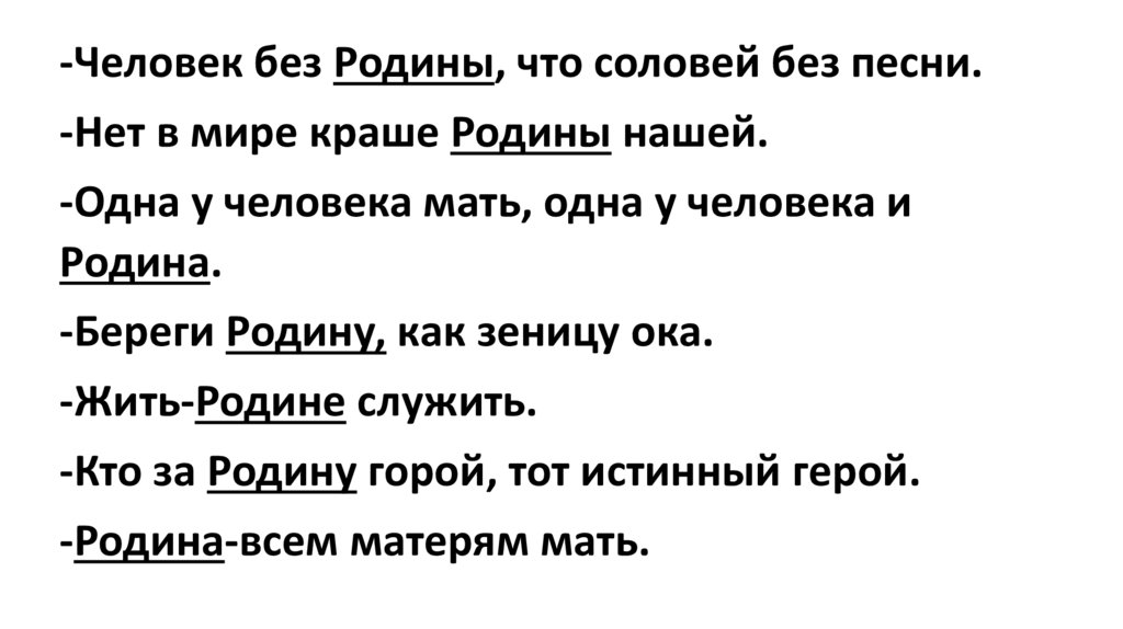 -Человек без Родины, что соловей без песни.-Нет в мире краше Родины нашей.