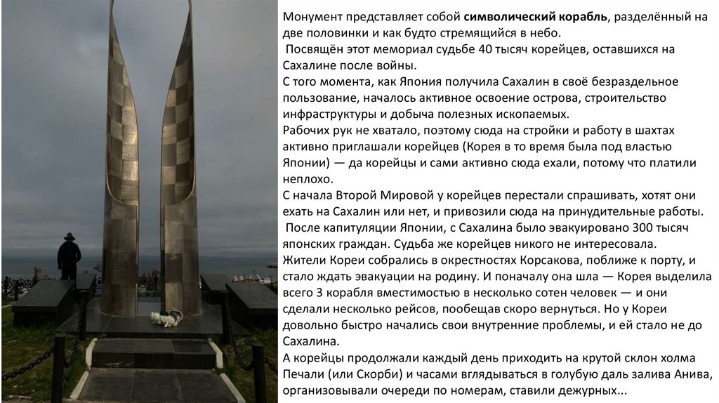 Посвящён этот мемориал судьбе 40 тысяч корейцев, оставшихся на