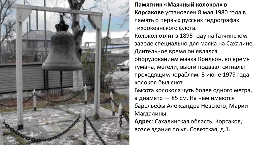 Памятник «Маячный колокол» вКорсакове установлен 8 мая 1980 года в