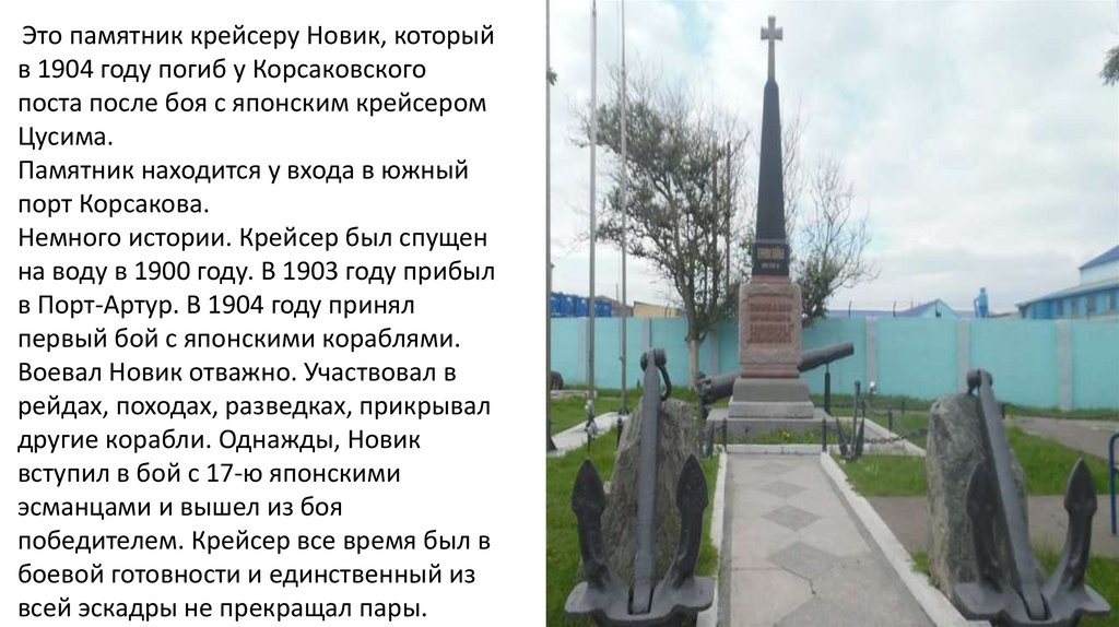 Это памятник крейсеру Новик, которыйв 1904 году погиб у Корсаковского