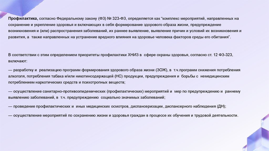 Профилактика, согласно Федеральному закону (ФЗ) № 323-ФЗ, определяется как “комплекс мероприятий, направленных насохранение и укрепление здоровья и включающих в себя формирование здорового образа жизни, предупреждение