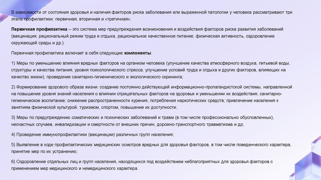 Первичная профилактика – это система мер предупреждения возникновения и воздействия факторов риска развития заболеваний