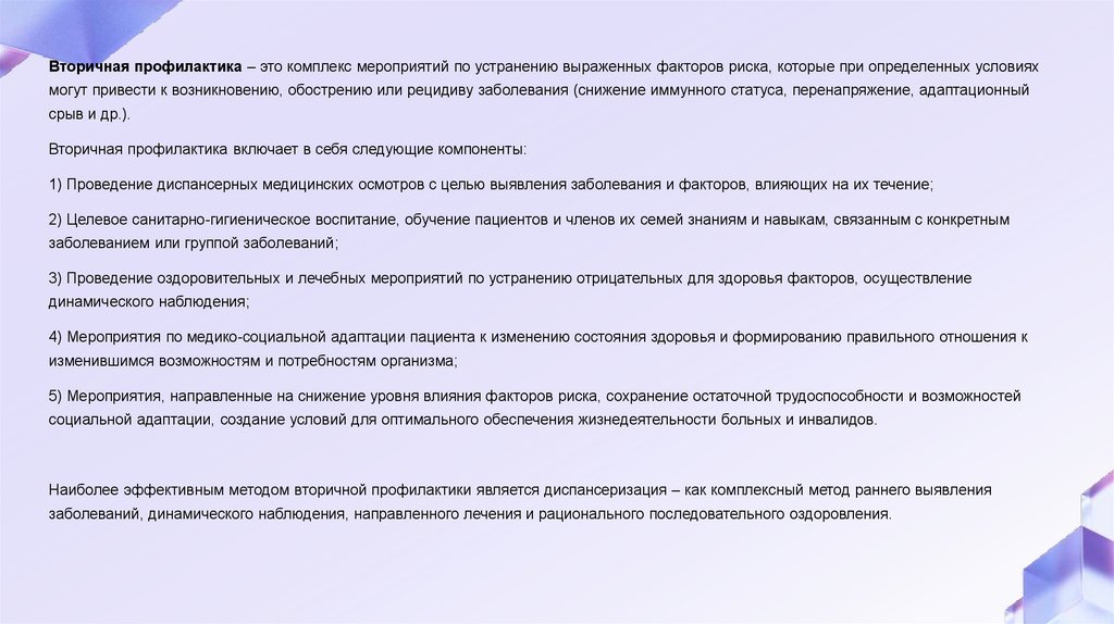 Вторичная профилактика – это комплекс мероприятий по устранению выраженных факторов риска, которые при определенных условияхмогут привести к возникновению, обострению или рецидиву заболевания (снижение иммунного статуса, перенапряжение, адаптационный