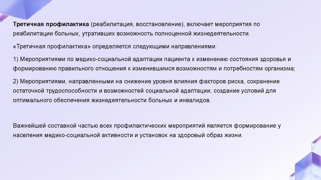 Третичная профилактика (реабилитация, восстановление), включает мероприятия пореабилитации больных, утративших возможность полноценной жизнедеятельности.