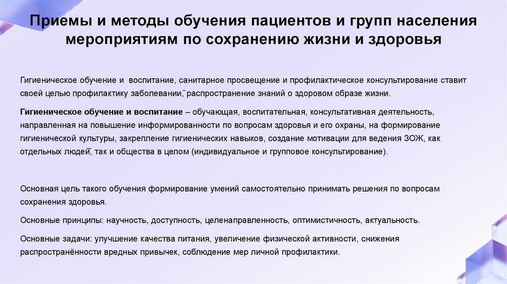 Приемы и методы обучения пациентов и групп населениямероприятиям по сохранению жизни и здоровья