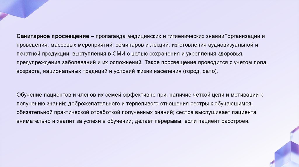 Санитарное просвещение – пропаганда медицинских и гигиенических знании ̆ организации ипроведения, массовых мероприятий: семинаров и лекций, изготовления аудиовизуальной и