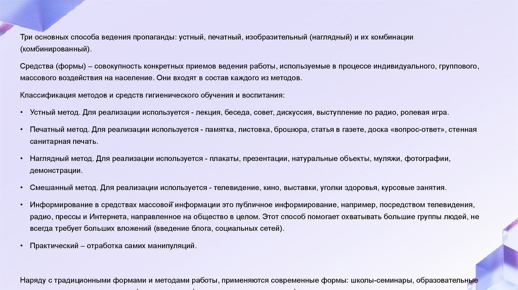 Классификация методов и средств гигиенического обучения и воспитания: