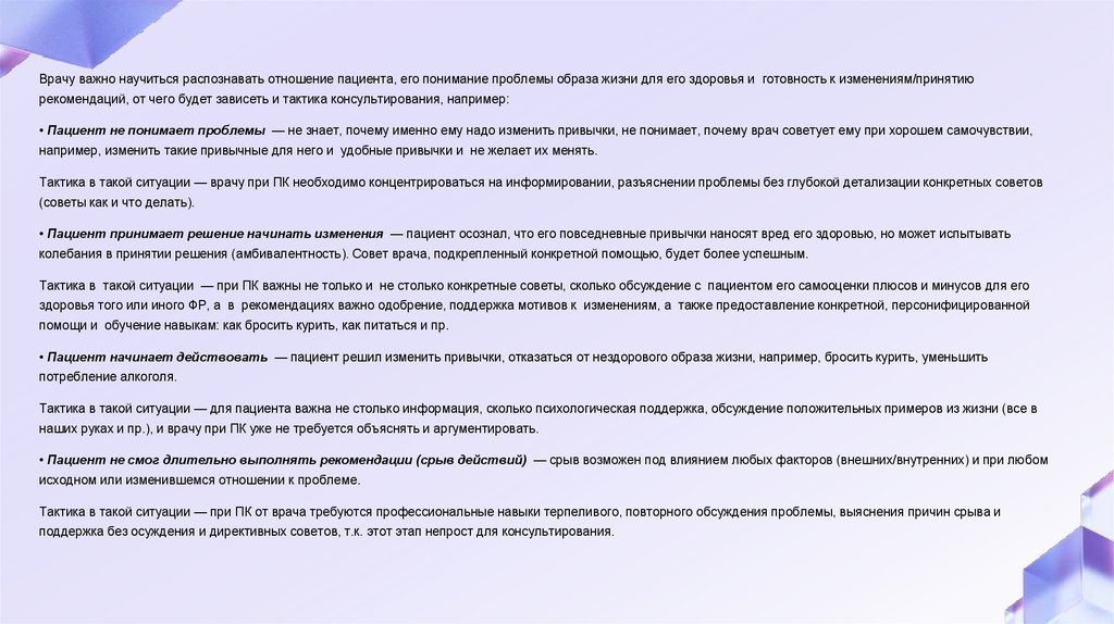 Тактика в такой ситуации — врачу при ПК необходимо концентрироваться на информировании, разъяснении проблемы без глубокой детализации конкретных советов