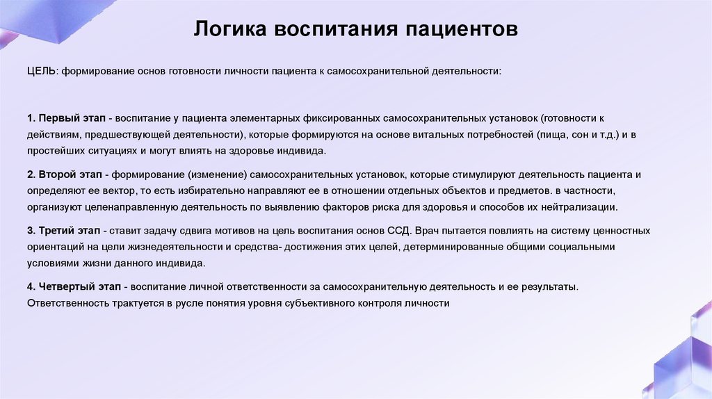 Логика воспитания пациентовЦЕЛЬ: формирование основ готовности личности пациента к самосохранительной деятельности: