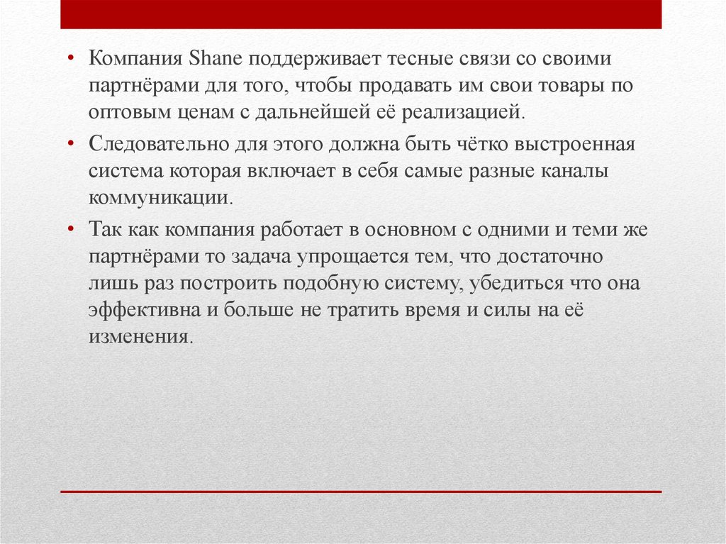 • Компания Shane поддерживает тесные связи со своимипартнёрами для того, чтобы продавать им свои товары по