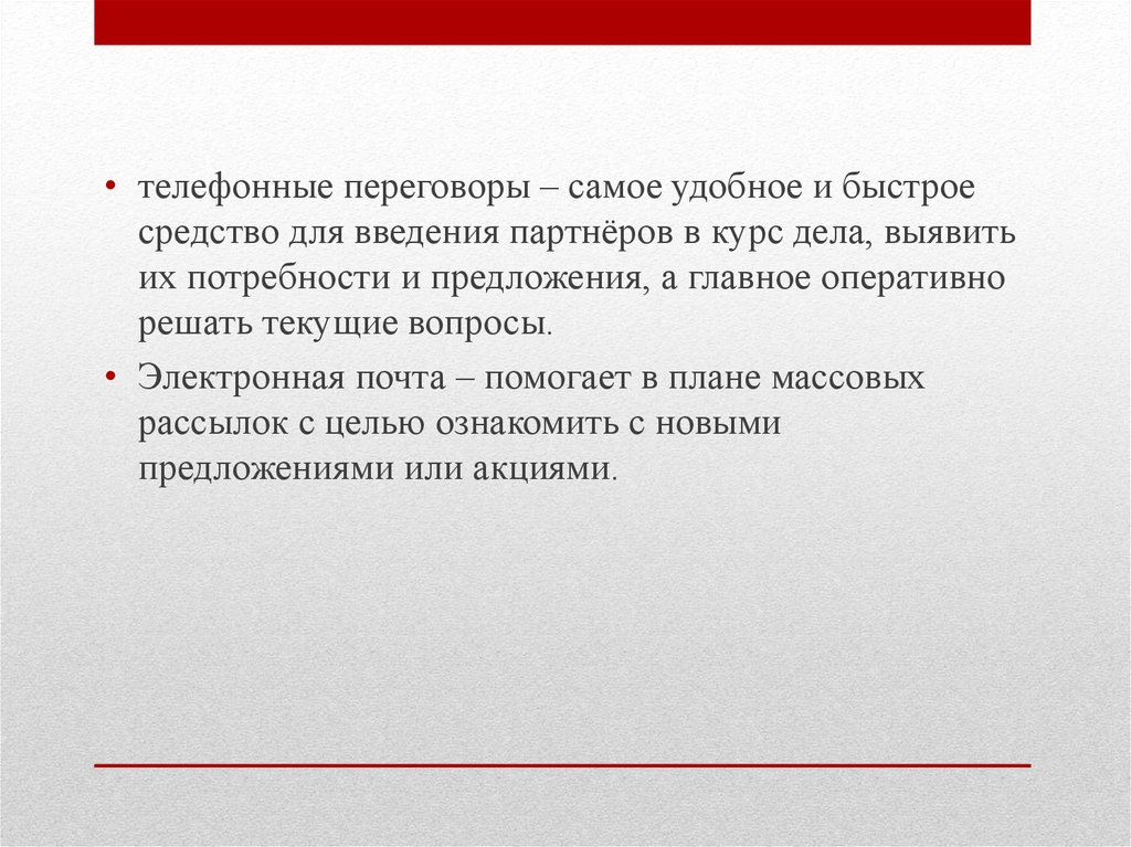 • телефонные переговоры – самое удобное и быстроесредство для введения партнёров в курс дела, выявить