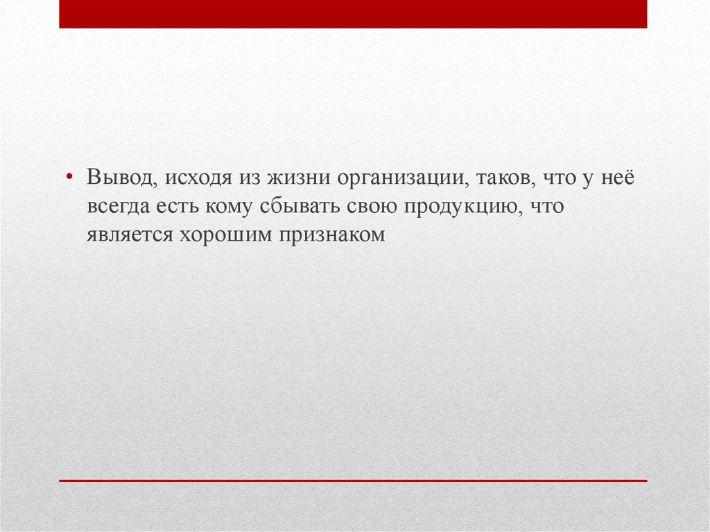 • Вывод, исходя из жизни организации, таков, что у неёвсегда есть кому сбывать свою продукцию, что