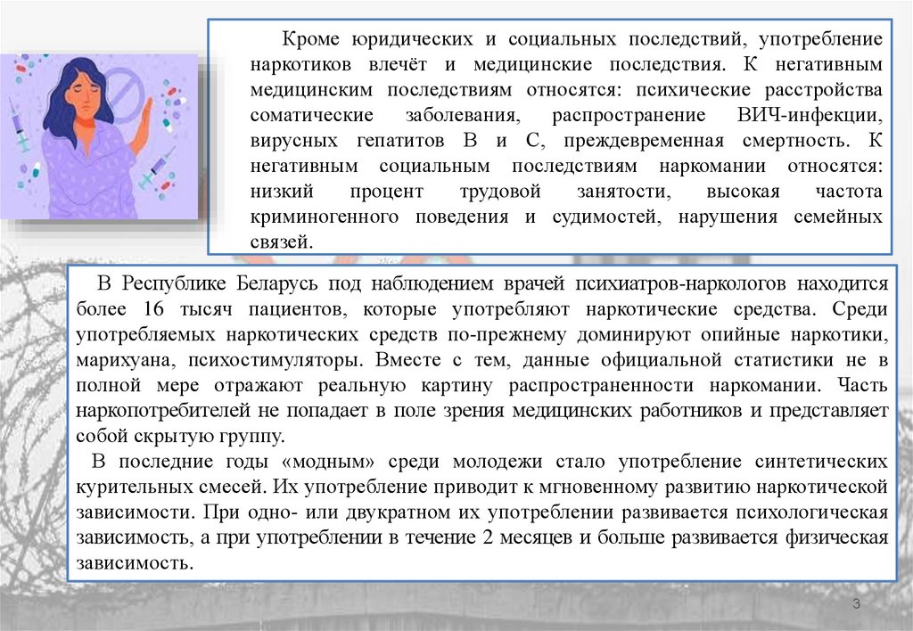 Кроме юридических и социальных последствий, употреблениенаркотиков влечёт и медицинские последствия. К негативным