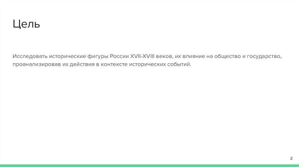 ЦельИсследовать исторические фигуры России XVII-XVIII веков, их влияние на общество и государство,