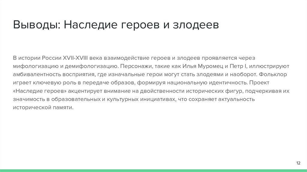 Выводы: Наследие героев и злодеевВ истории России XVII-XVIII века взаимодействие героев и злодеев проявляется через