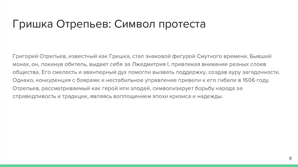 Гришка Отрепьев: Символ протестаГригорий Отрепьев, известный как Гришка, стал знаковой фигурой Смутного времени. Бывший