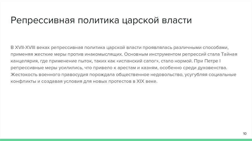 Репрессивная политика царской властиВ XVII-XVIII веках репрессивная политика царской власти проявлялась различными способами,