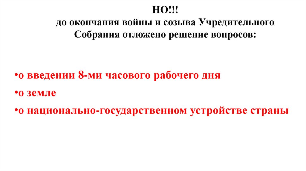 •немедленная подготовка к созыву Учредительного собрания, которое установит форму правления и