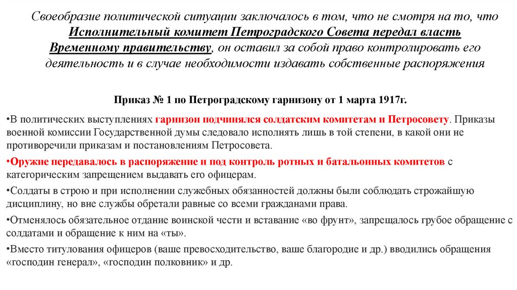 •неразоружение и невывод из Петрограда воинских частей, принимавших участие в революционном