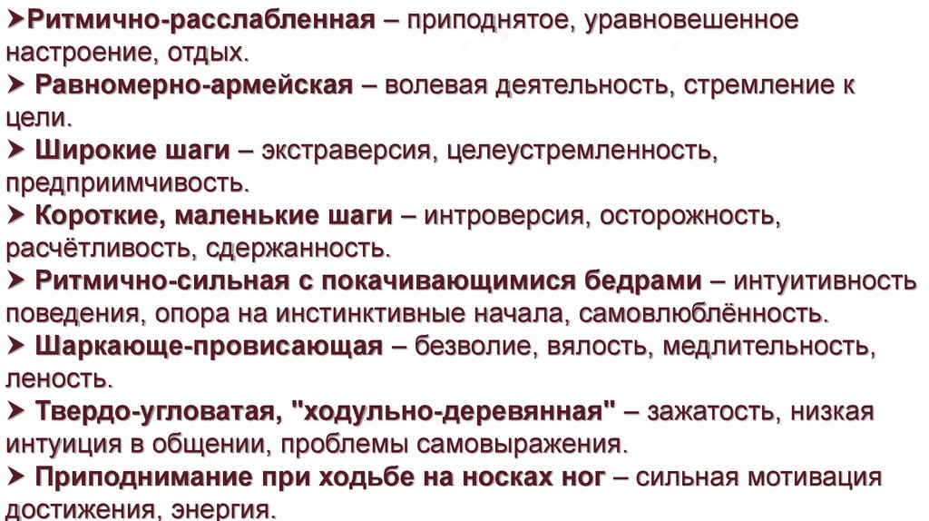 Шаркающе-провисающая – безволие, вялость, медлительность,