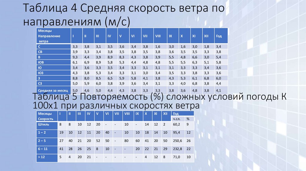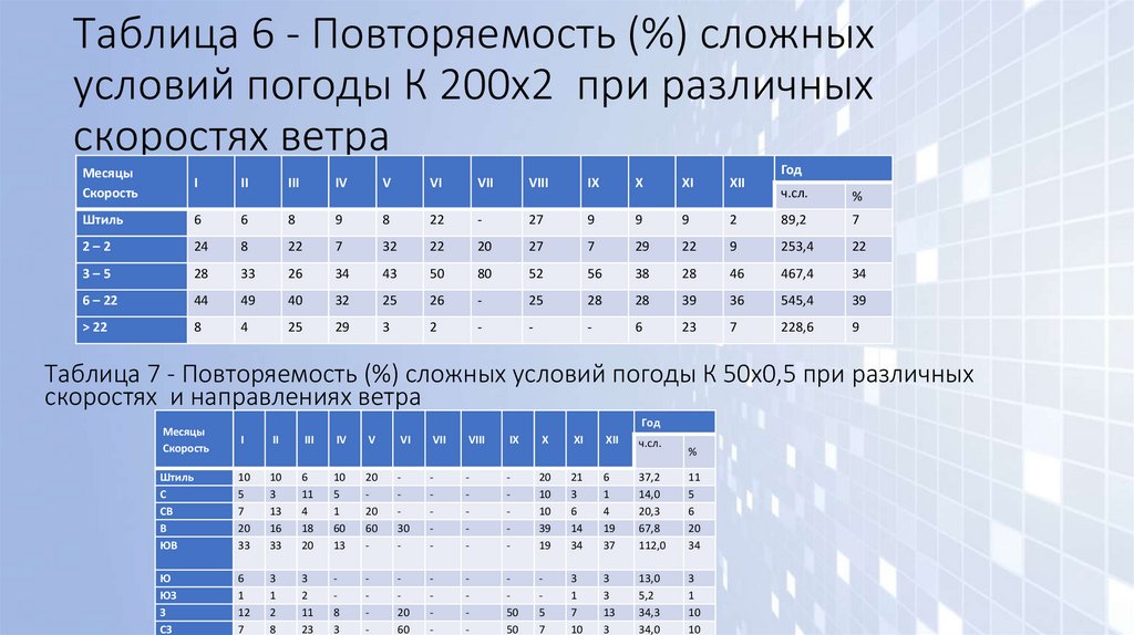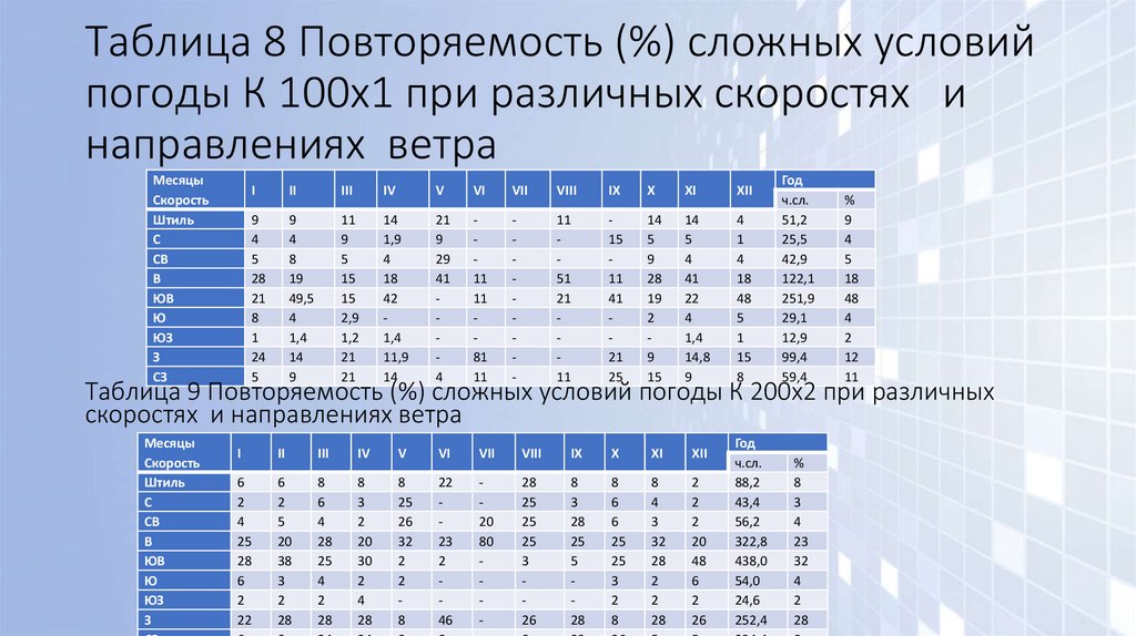 Таблица 8 Повторяемость (%) сложных условийпогоды К 100х1 при различных скоростях и