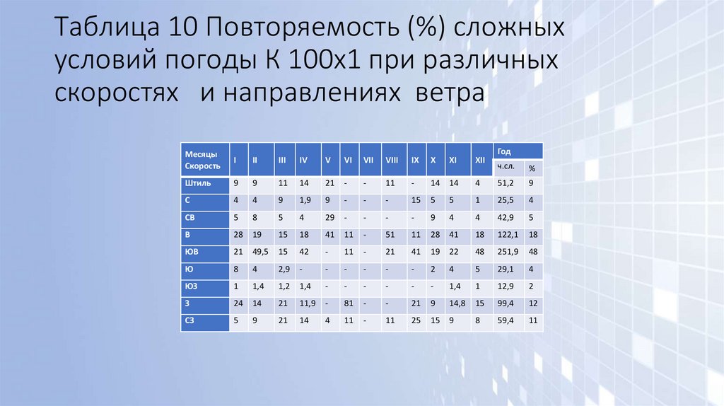 Таблица 10 Повторяемость (%) сложныхусловий погоды К 100х1 при различных
