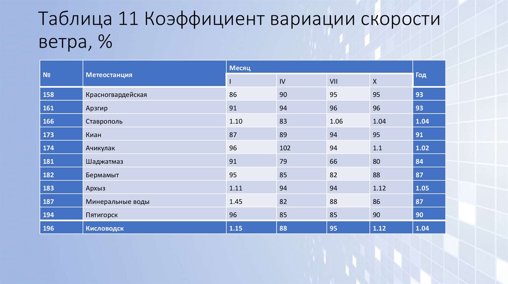 Таблица 11 Коэффициент вариации скоростиветра, %