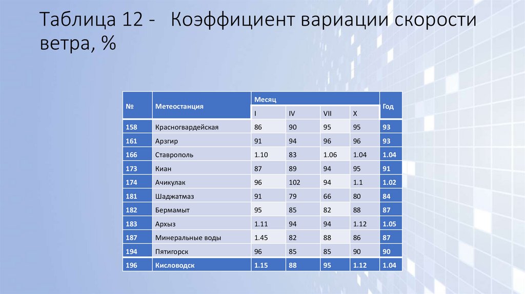 Таблица 12 - Коэффициент вариации скоростиветра, %