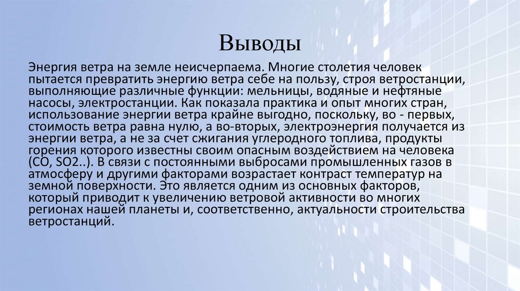 ВыводыЭнергия ветра на земле неисчерпаема. Многие столетия человек