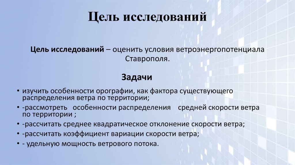 Цель исследованийЦель исследований – оценить условия ветроэнергопотенциала