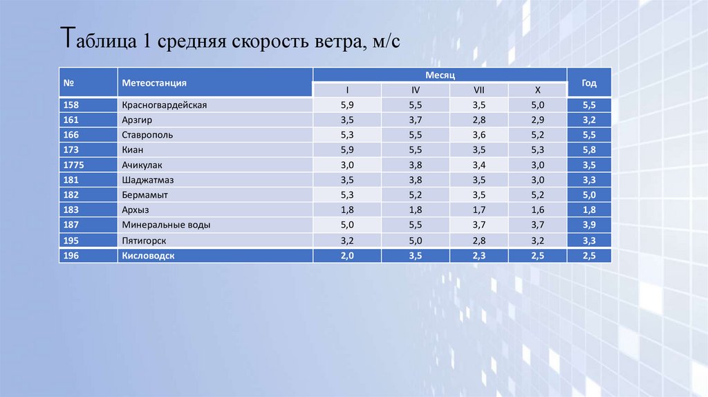 приходятся на северо-западный район Ставропольского края. По мере приближения к юговосточному району (с запада на восток) средние скорости уменьшаются до 1,8 м/с, а коэффициенты