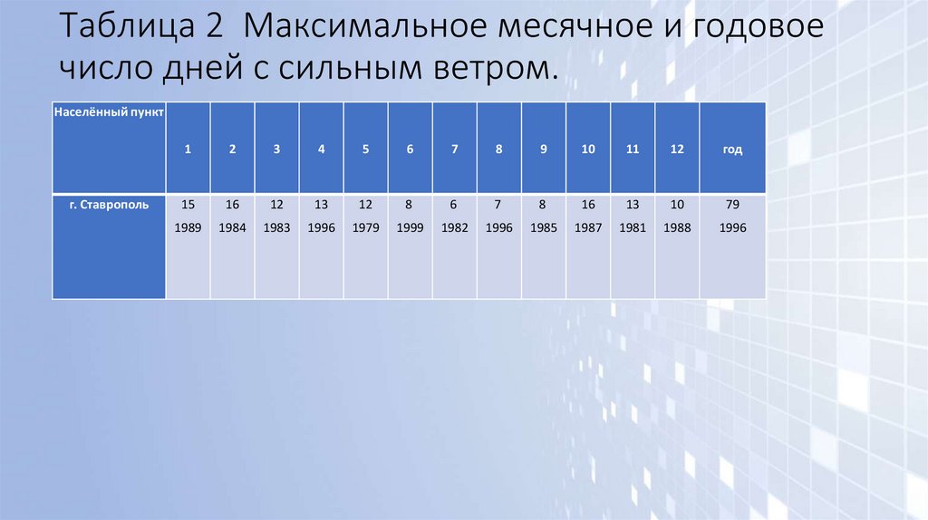 Таблица 2 Максимальное месячное и годовоечисло дней с сильным ветром.