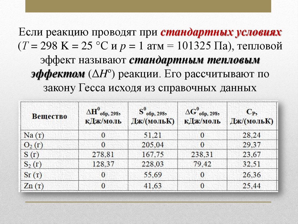 Если реакцию проводят при стандартных условиях(Т = 298 K = 25 °С и p = 1 атм = 101325 Па), тепловой