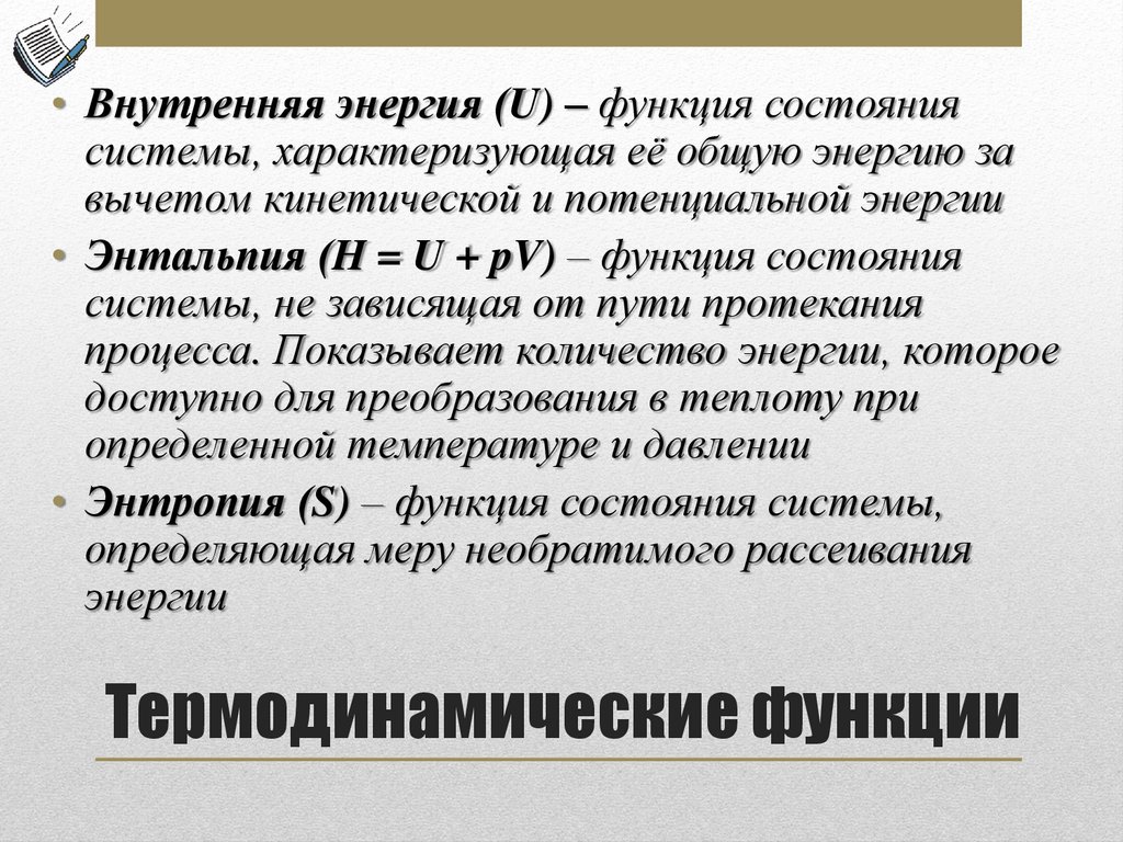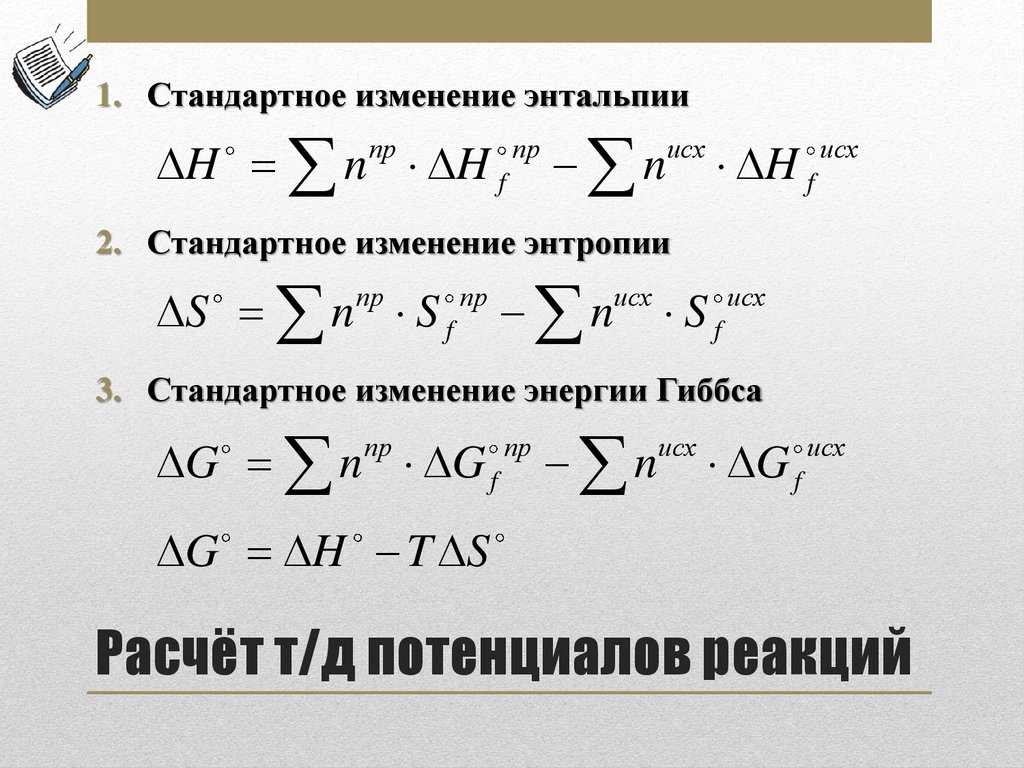 энергия, энтальпия, энтропия, энергия Гиббса и пр.)