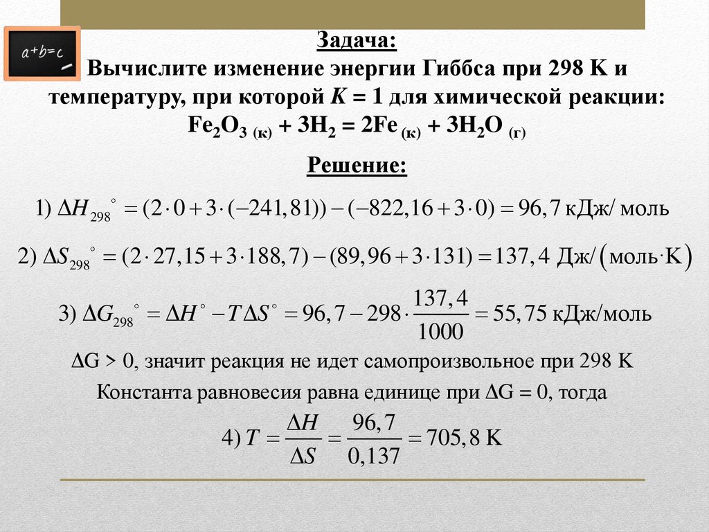 Задача:Вычислите изменение энергии Гиббса при 298 K и