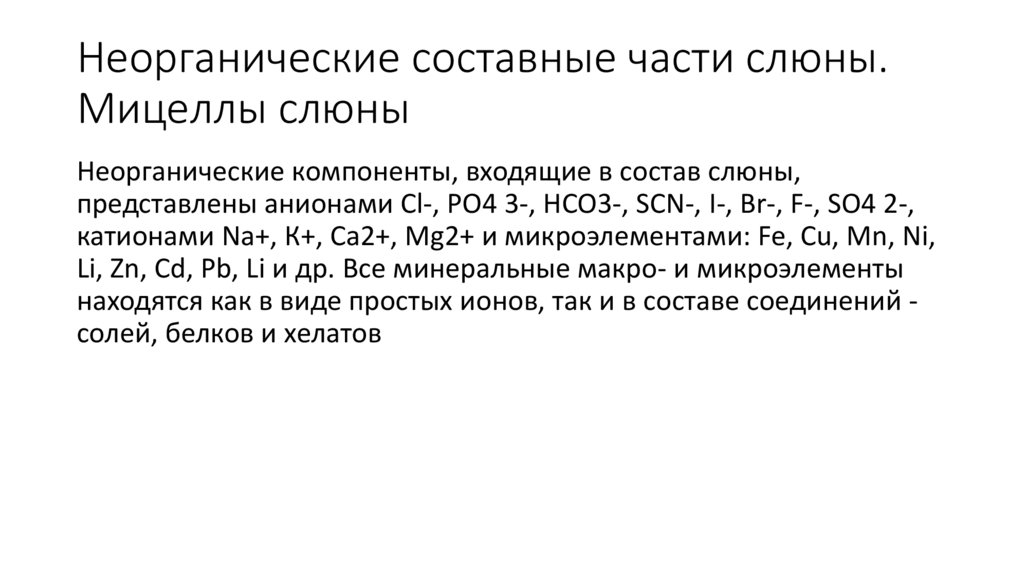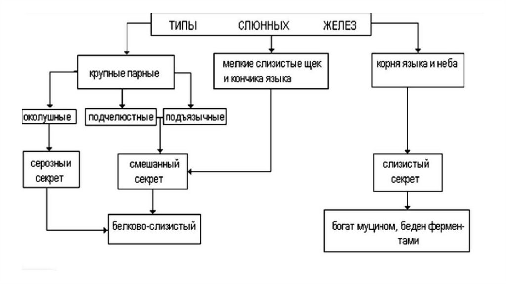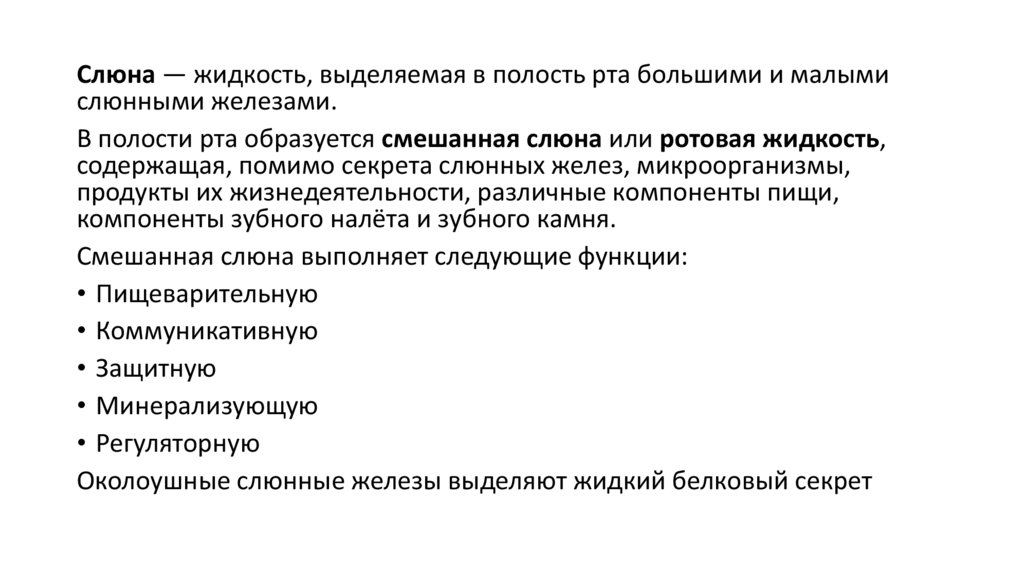Слюна — жидкость, выделяемая в полость рта большими и малымислюнными железами.
