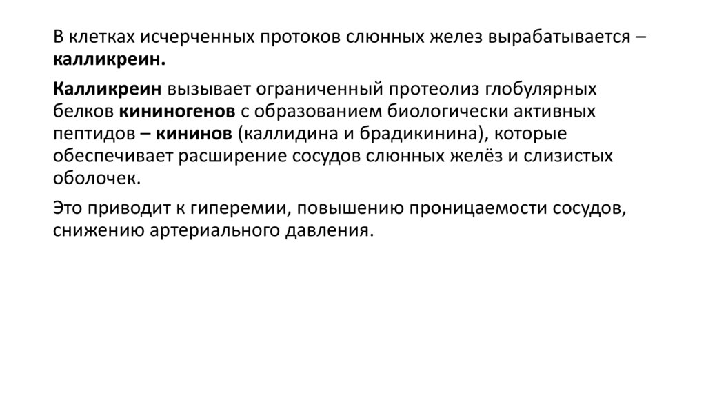 В клетках исчерченных протоков слюнных желез вырабатывается –калликреин.
