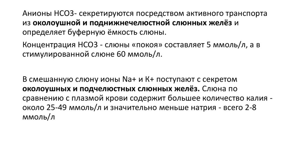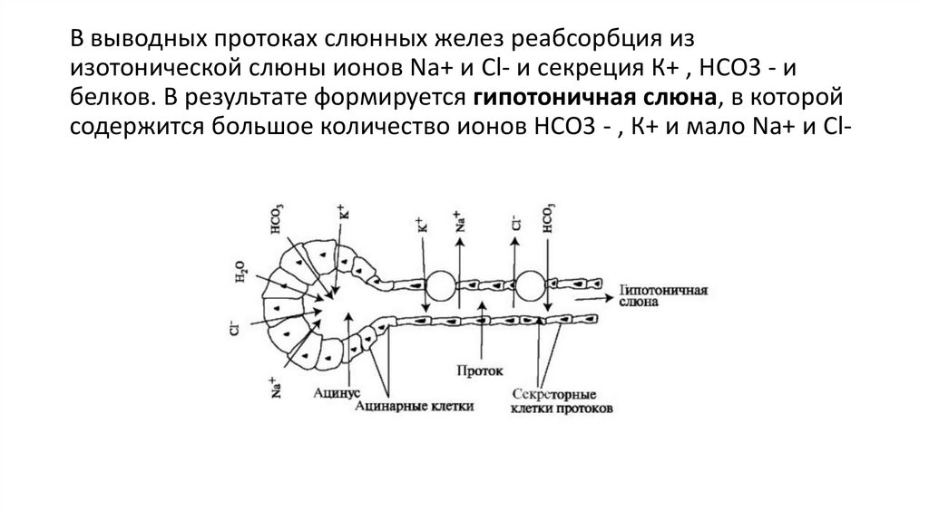 В выводных протоках слюнных желез реабсорбция изизотонической слюны ионов Na+ и Cl- и секреция К+ , НСО3 - и