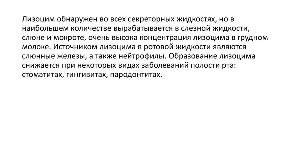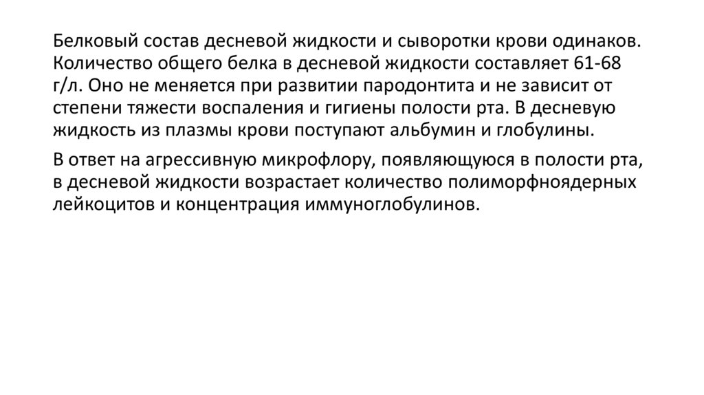 Белковый состав десневой жидкости и сыворотки крови одинаков.Количество общего белка в десневой жидкости составляет 61-68