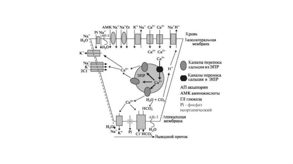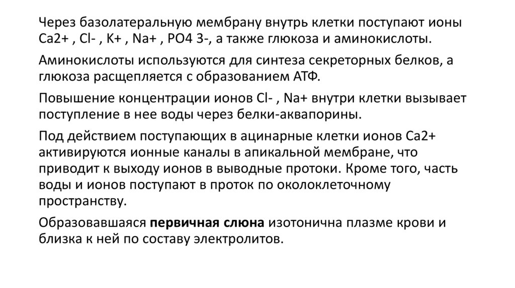 Через базолатеральную мембрану внутрь клетки поступают ионыCa2+ , Cl- , K+ , Na+ , PO4 3-, а также глюкоза и аминокислоты.
