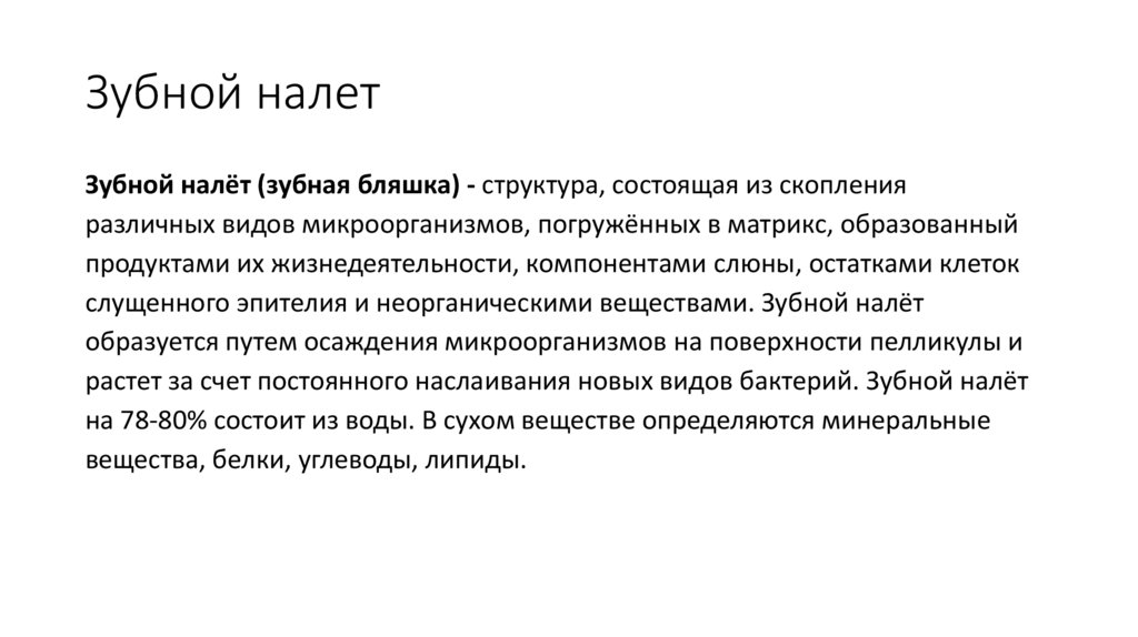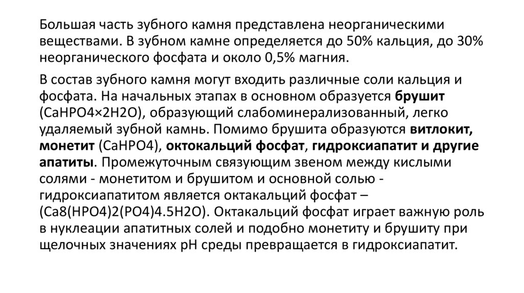 Большая часть зубного камня представлена неорганическимивеществами. В зубном камне определяется до 50% кальция, до 30%