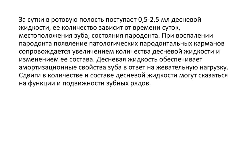 За сутки в ротовую полость поступает 0,5-2,5 мл десневойжидкости, ее количество зависит от времени суток,