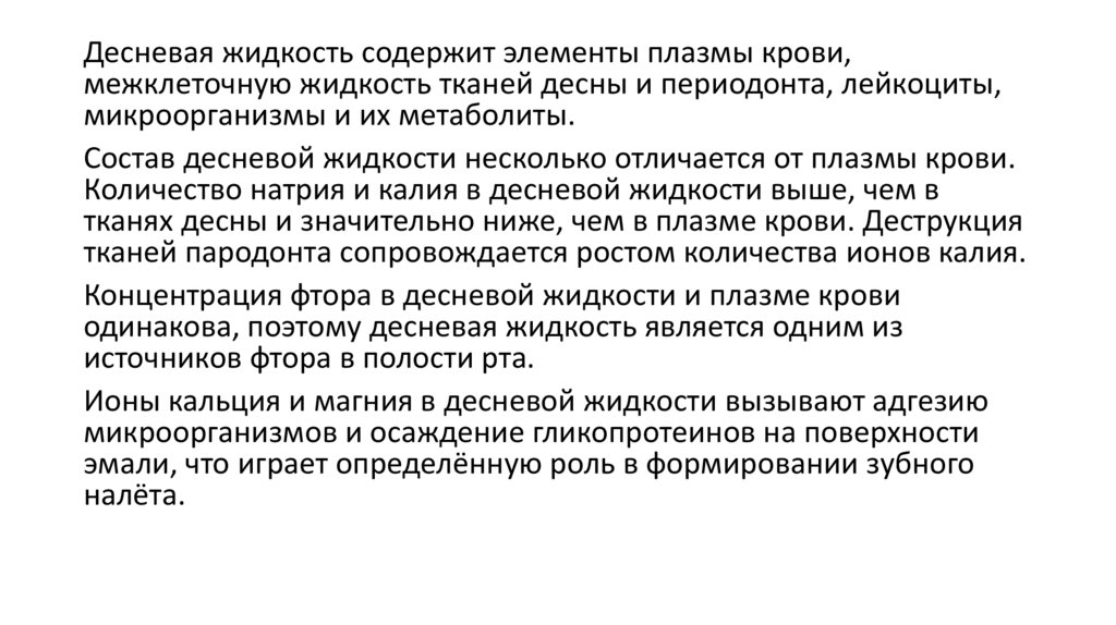 Десневая жидкость содержит элементы плазмы крови,межклеточную жидкость тканей десны и периодонта, лейкоциты,