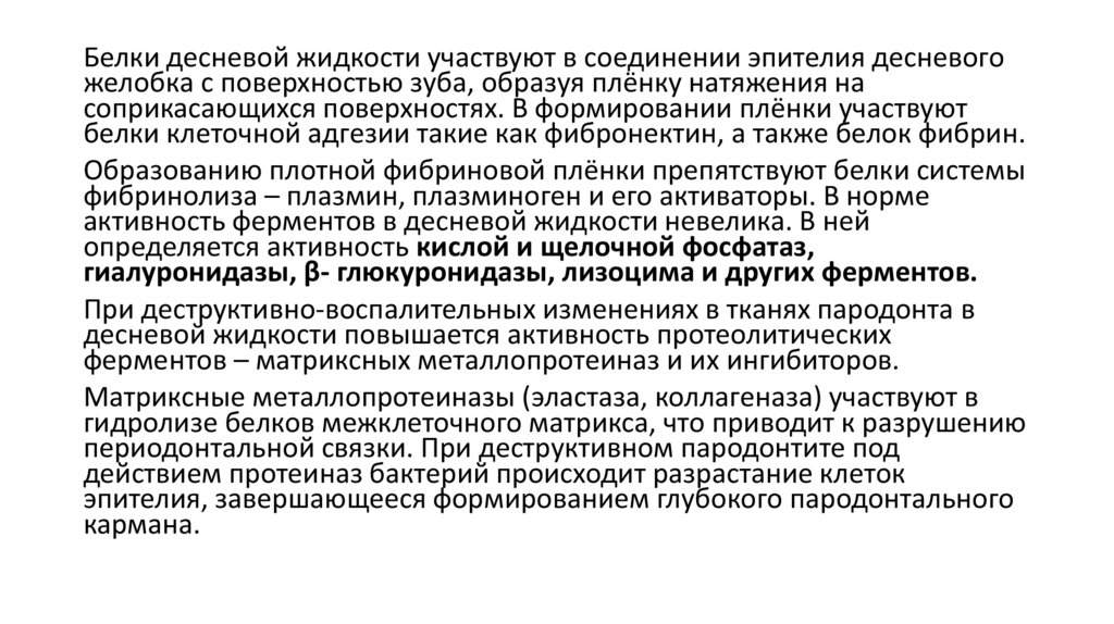 Белки десневой жидкости участвуют в соединении эпителия десневогожелобка с поверхностью зуба, образуя плёнку натяжения на