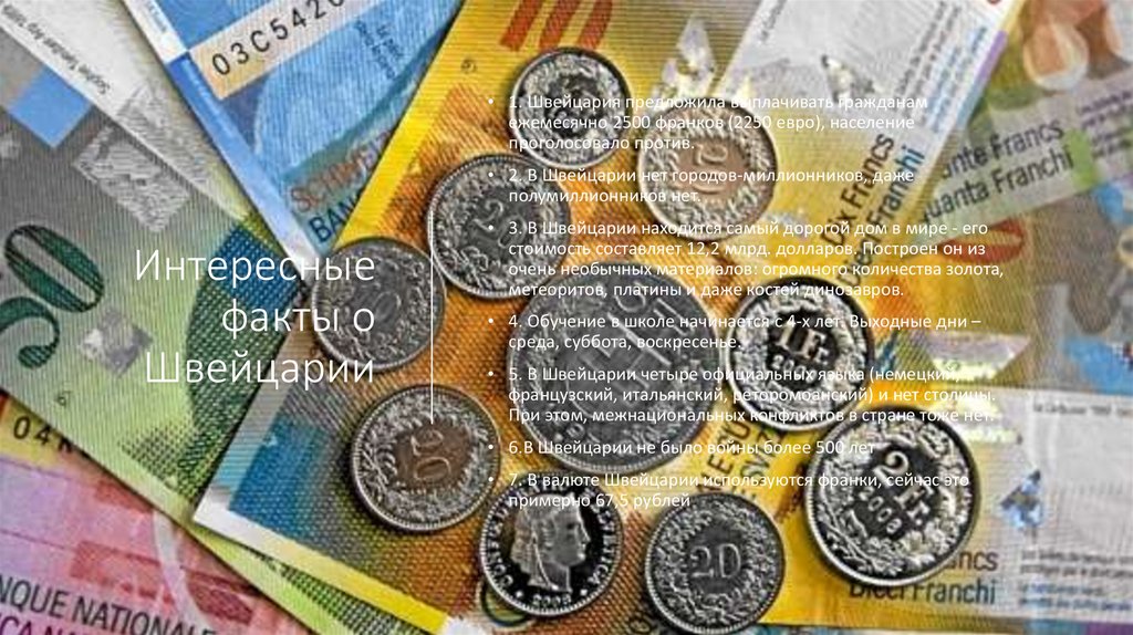 • 7. В валюте Швейцарии используются франки, сейчас это