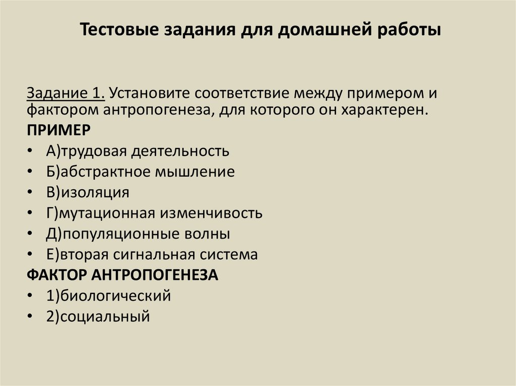Задание 5. Какие факторы антропогенеза можно отнести кбиологическим?