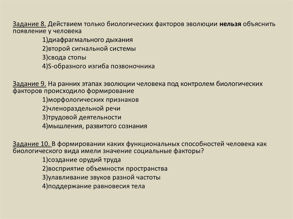 Задание 8. Действием только биологических факторов эволюции нельзя объяснитьпоявление у человека