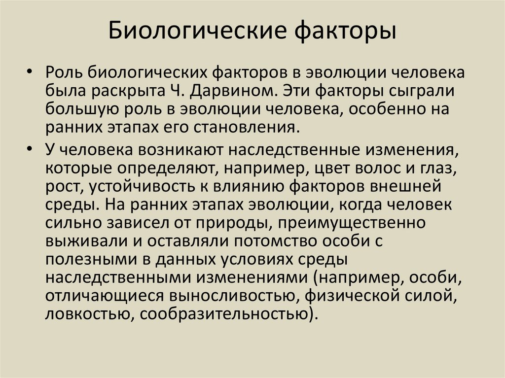 Биологические факторы• Роль биологических факторов в эволюции человека