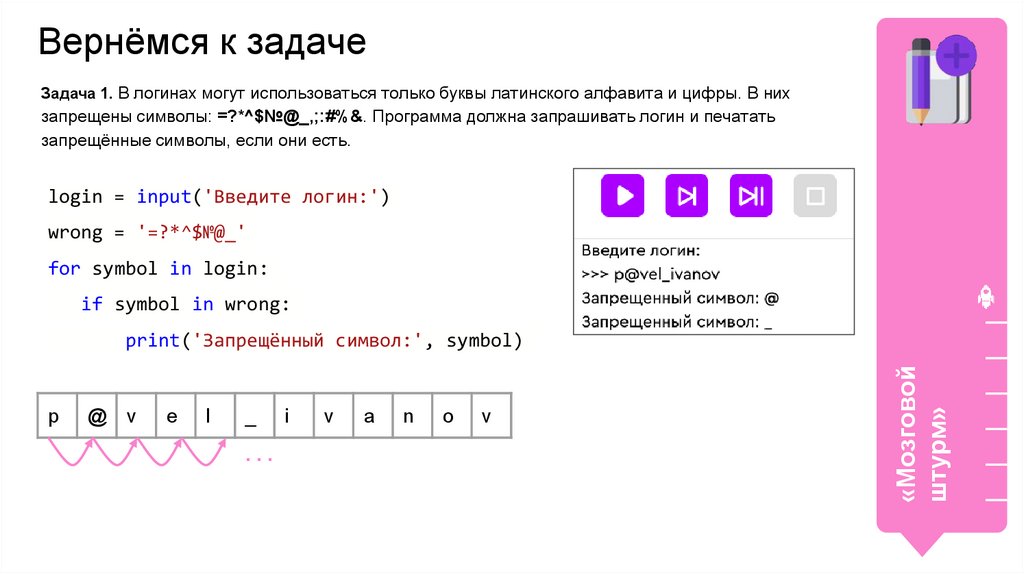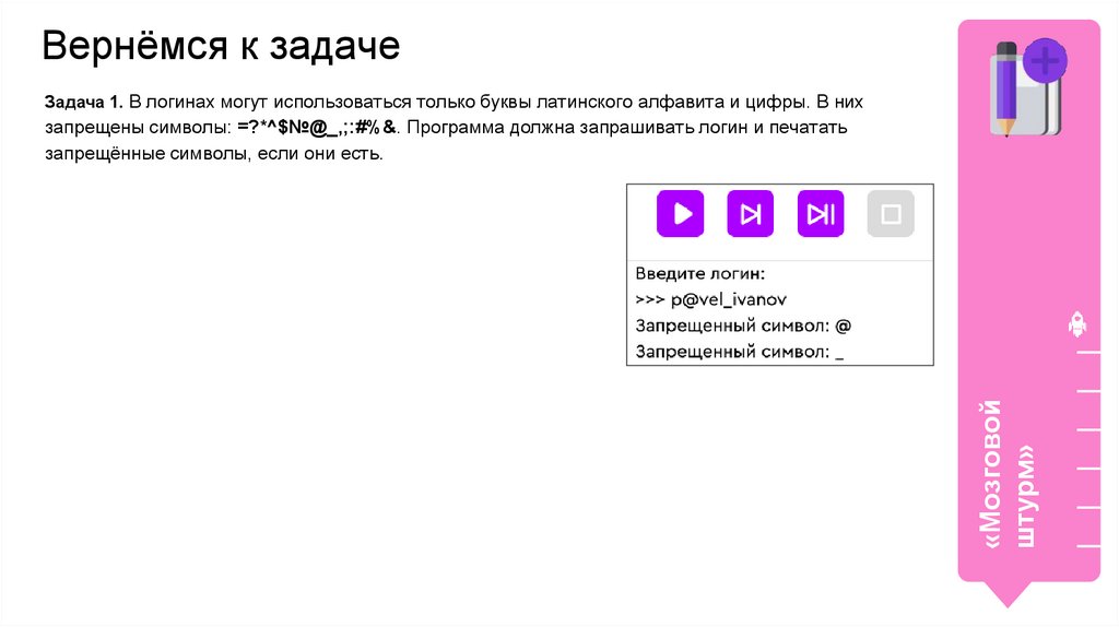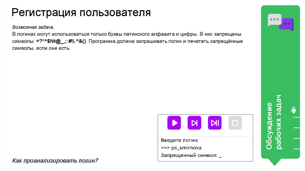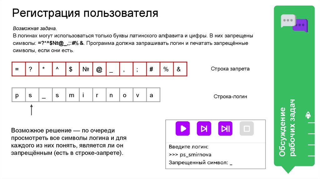 символы: =?*^$№@_,;:#%&. Программа должна запрашивать логин и печатать запрещённые
