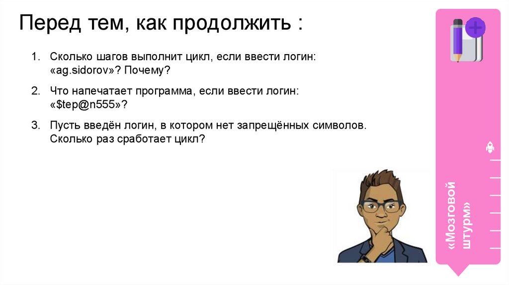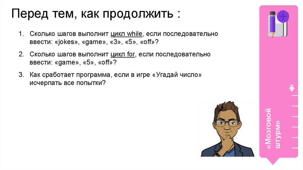 Перед тем, как продолжить :1. Сколько шагов выполнит цикл while, если последовательно